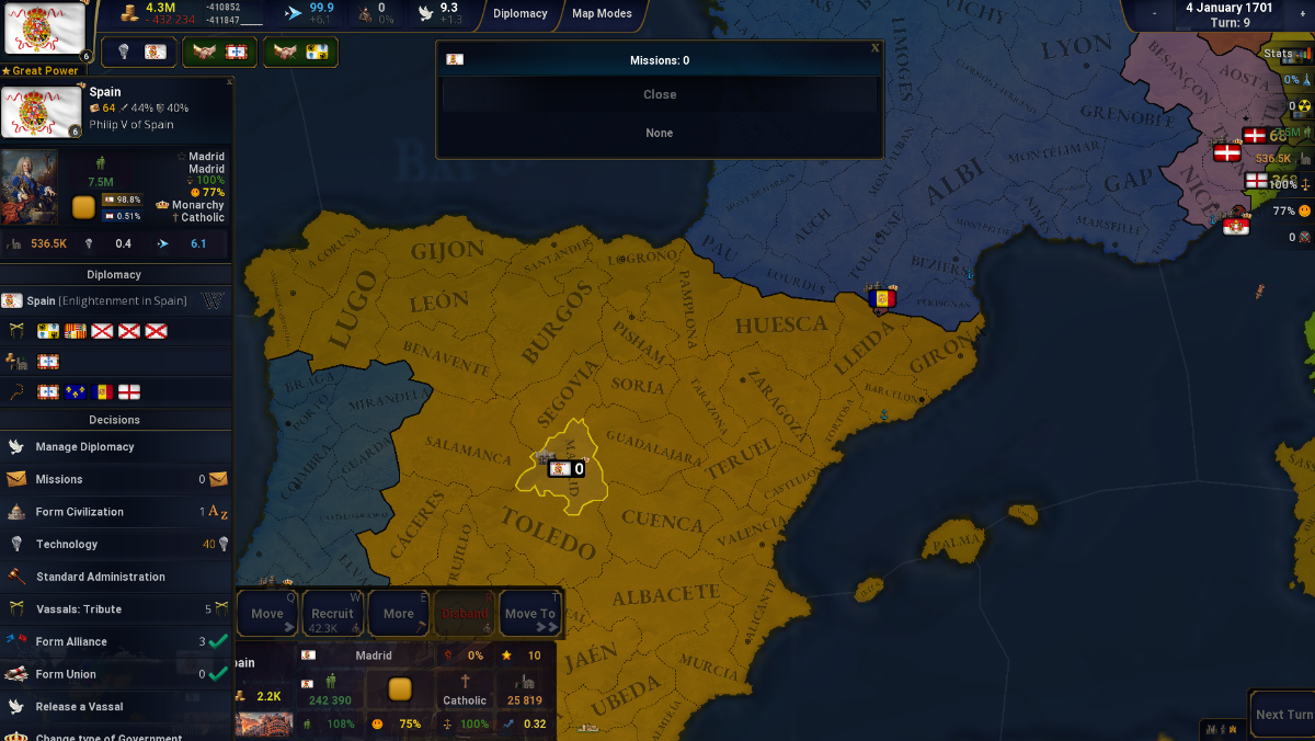 Just play Spain and wait till Philip V will be a monarch and you will see that there is no mission for Spain